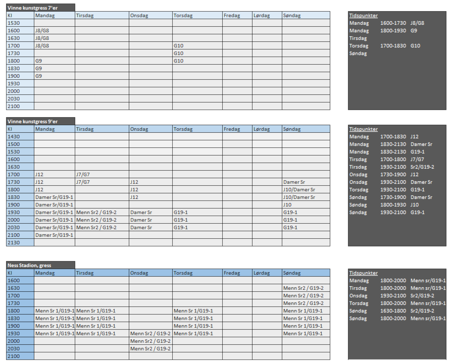 Oversikt over treningstider for lagene i Vinne IL 2026