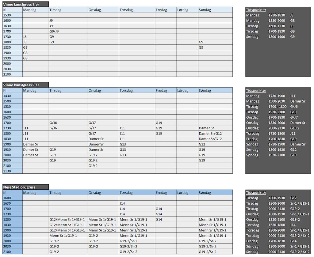 Oversikt over treningstider for lagene i Vinne IL 2025